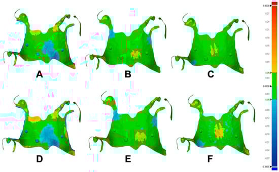 Sample of color maps of the three-dimensional deviations of different groups generated by the metrology software with a color-coded scale showing level of deviations. (A–C) represent 110, 135, and 150-degree angles with thin support structures. (D–F) represent same angle sequence but with thick support structures.