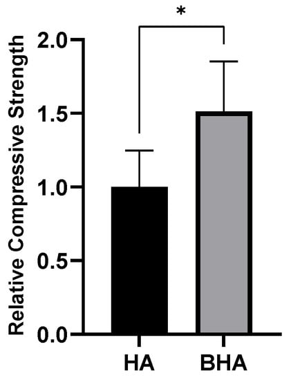 Relative compressive strength of BHA and HA. Each bar shows the mean ± SD ratio. * p < 0.05 based on the unpaired t-test.