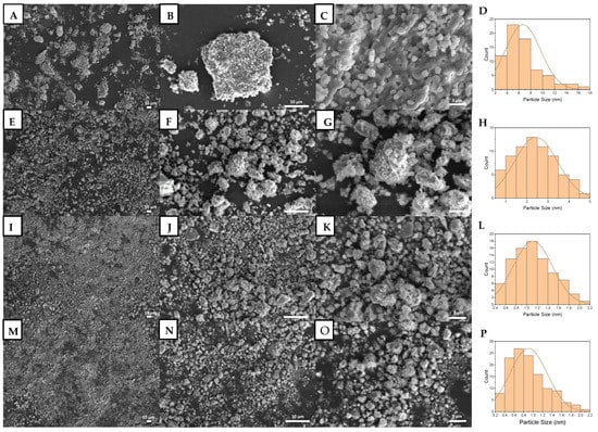 SEM images and particle size distribution of unmilled BHA (A–D), BHA milled for 3 h (E–H), BHA milled for 6 h (I–L), and BHA milled for 9 h (M–P). (A,E,I,M) Images show total magnification of 1000×. (B,F,J,N) Images show total magnification of 5000×. (C,G,K,O) Images show total magnification of 15,000×. (D,H,L,P) Graphs show the corresponding particle size distributions.