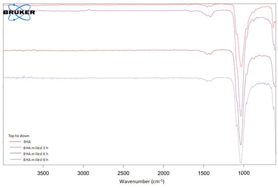 Our current study also found that milling treatment reduced the crystallinity of BHA. Reductions in material crystallinity generally occurs because of milling treatment, such as reported by Ma et al. [39]. The study reported that a high-energy milling treatment reduced the crystallinity of MgCu. This incident is related to grain refinement and the impingement of milling balls with material, which decreased XRD peaks [39].