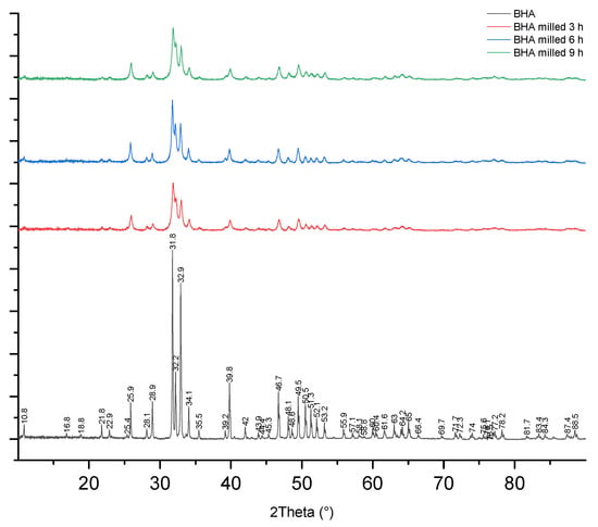 Milling treatment did not affect the characteristics of BHA based on its functional chemical groups. FTIR spectra showed that all materials had carbonate and phosphate groups present at a wavenumber of 1455 cm−1 and 1000–1100 cm−1, respectively (Figure 3). Moreover, the carbonate group detected in all BHA samples was not present in HA (Figure S1C). The XRD pattern and peaks of unmilled and milled BHA are presented in Figure 4. BHA had 84.02% crystallinity, while BHA milled for 3, 6, and 9 h had 65.81%, 60.98%, and 60.70% crystallinity, respectively. In addition, the calcium-to-phosphorus (Ca/P) of unmilled and milled BHA ranged from 1.48 to 1.68 (Table 1). The Ca/P of all BHA samples (unmilled and milled) is higher than that found in synthetic HA (Figure S1E).