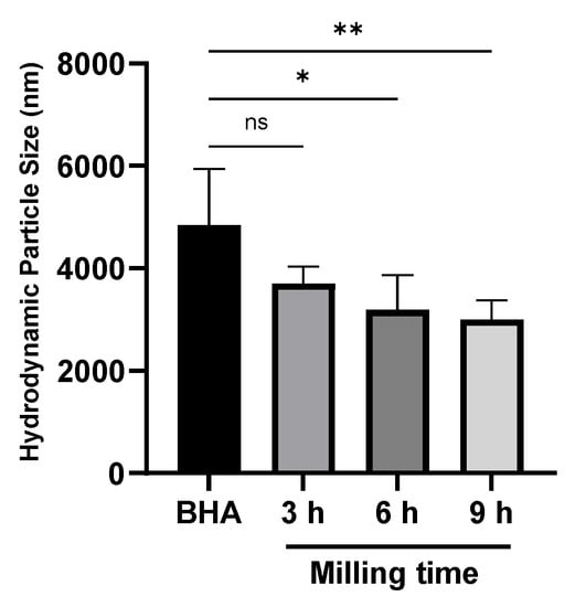 The hydrodynamic particle size of milled and unmilled BHA. Each bar shows the mean ± SD value. * p < 0.05, ** p < 0.01 based on a one-way ANOVA test.