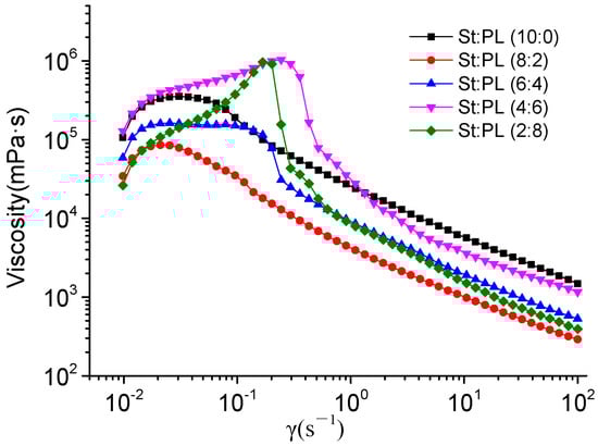 The rheological properties of the films with different St/PL mass ratios were compared (Figure 1). With the increase in shear rate, the viscosity of the five samples first rose to the highest point and then decreased steadily. The films were pseudoplastic fluids in the case of shear thinning [30]. The viscosity was highest for the sample with a St/PL ratio of 4:6, at 1.03 × 106 MPa·s, followed by the films with the ratio of 2:8, 10:0, 6:4, and 2:8. In addition, the shear rate of the 4:6 film was 0.241 s−1. After entering the steady state, the viscosity of the film solution with a St/PL ratio of 10:0 reached the maximum, while the other samples decreased with increasing proportions of PL, mainly due to the decrease of viscosity accompanied by the increasing proportions of small molecules (PL) [31]. However, the solubility of PL in the formula system and St would lead to inconsistency between the viscosity of the sample and the formula; thus, the 4:6 film had the highest viscosity, followed by the 6:4, 2:8, and 8:2 films.