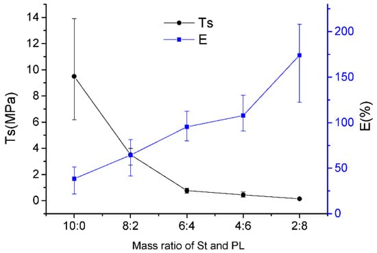 The films with varying St/PL mass ratios had significantly different mechanical properties (Figure 2). The TS of the composite films decreased, and the break elongation increased with increasing proportions of PL. When the St/PL mass ratio changed from 10:0 to 6:4, the TS decreased significantly; however, the declining trend was slowed from 6:4 to 2:8 because the main component of the composite film changed from St to PL, and PL’s molecular weight was lower than St’s. The winding and rigid structure of starch macromolecules display great differences in macro mechanical properties. Although the amount of PL increased because its lower molecular weight reduced the rigidity of the network structure, the TS of the composite film was less affected when the St/PL mass ratio exceeded 6:4. In addition, break elongation increased with the increasing proportion of PL because PL also played a plasticizing role in the system. PL increased the sliding between starch macromolecules, enhancing the break elongation value from 38.41 to 172.03%. However, a film could not be formed when PL was only used as the matrix and sodium alginate and glycerol were used as plasticizers. Therefore, in this work, there was no film with a St/PL mass ratio of 0:10 to be tested for performance.