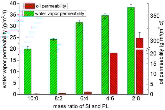 Water vapor permeability and oil permeability of the composite films with St/PL mass ratios.