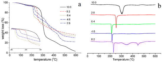 TGA and DTA curves of the composite films with different St/PL mass ratios. (a) TGA. (b) DTG.