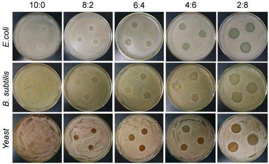 We chose Escherichia coli (ATCC 25312), Bacillus subtilis (ATCC 23857), and yeast (Saccharomyces cerevisiae, ATCC 204508) (from the college’s microbiology laboratory) to test the antimicrobial properties of the composite films [23]. We put three prepared media, routine broth, Luria–Bertani broth, and yeast extract peptone dextrose, into triangular bottles and wrapped up the Petri dishes, coating sticks, and other items to sterilize with damp heat. Then, a medium was poured into a plate on an ultra-clean workbench, marked, and cooled. Next, 10 μL (107–8 CFU) of a bacterial suspension was added into the corresponding culture medium, coated evenly, and allowed to infiltrate. Afterward, the films prepared with different St/PL ratios were made into small discs with a diameter of about 10 mm with a hole punch and carefully placed on a bacteria-coated plate to incubate in a constant temperature incubator at 37 °C for 24–48 h. Subsequently, the sizes of the antimicrobial circles on the plates were observed to assess the antimicrobial activity of the films.