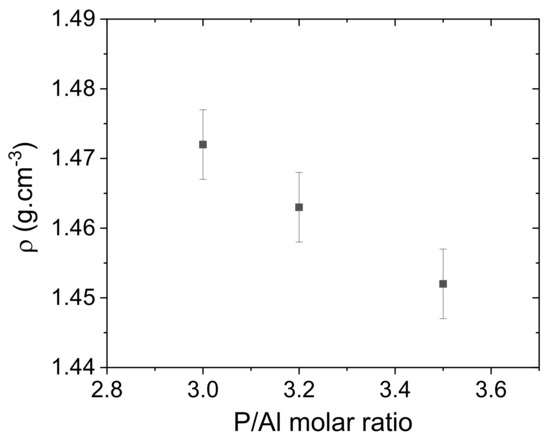 Data about the composition, P/Al molar ratio, P concentration [P], and density (ρ) are reported for the three solutions in Table 3. All the solutions are stable at room temperature (no precipitation was observed after several weeks of storage). As shown in Figure 1, the density values decrease when the P/Al ratio increases in agreement with the lower amount of introduced Al(OH)3 compound. The density values found in literature cannot be compared because the investigated solutions present lower P/Al ratio and/or higher [P] leading to much higher density values [3,13].