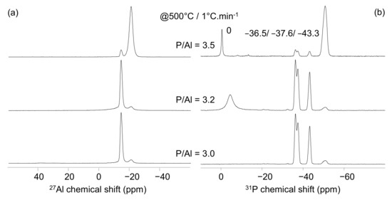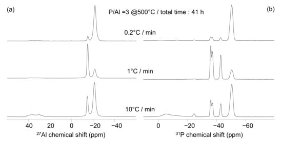 The 27Al and 31P NMR spectra obtained at 500 °C on the P/Al = 3 solution at different heating rates but with a constant dwell time of 1 h are presented in Figure 4. The two peaks at −21.4 and −15 ppm are present in the three 27Al NMR spectra (Figure 4a).