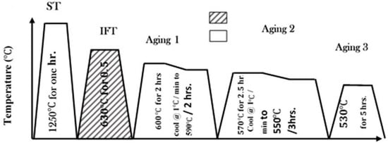 In order to find the optimum condition of the heat treatment for the ridge alloys, the optimum isothermal field treatment was first schematically determined by the procedure shown in Figure 1. It should be noted that the specimens are not continuously slow-cooled to the IFT temperature because of the formation of a γ or δ phase during the cooling. The IFT applied to the considered alloys was 620–640 °C for 10–35 min followed by slow cooling to 600 °C at the rate of 1 °C per minute under external magnetic field and then air cooled. The intensity of the external magnetic field was 4.86 kOe (400 kA/m) for the specimen throughout the present work. The optimized temperature for IFT was 630 °C and the optimized soaking time was 30 min followed by 1 °C per minute, cooling to 600 °C and then specimen bricks were subjected to subsequent aging treatments of Age 1, Age 2 and Age 3.