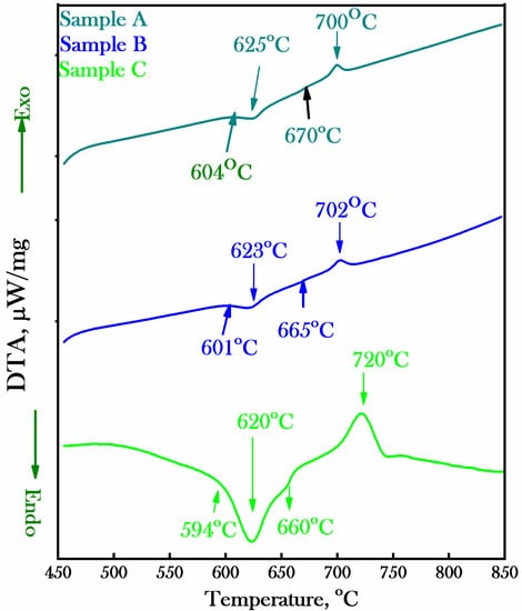 The results of DTA as a function of temperature for the presented Sample A, Sample B and Sample C alloys after complete processing are shown in Figure 2. Calibration files used for correction, temperature and sensitivity were 5 °C per min with an argon inert atmosphere in a silicon carbide heating element furnace. The silicon carbide heating element furnace has capability of ±1 °C accuracy with a controlled heating rate of 1–50 °C/min (RT-1600) °C. The Sample A, Sample B and Sample C alloys were analyzed for the temperature range of 450–850 °C in the controlled Ar inert atmosphere at the heating rate 5 °C/min as well as for the baseline. The alloys were analyzed with baseline correction file prepared by empty reference and the sample crucibles plus lid from room temperature (RT) to 1200 °C at the rate of 5 K/min in the Al2O3 crucible and lid. The weighing conditions for the sample crucible plus lid and reference crucible plus lid were 30 mg and 1456.8 mg, respectively. The inert argon gas flow at protective and purging was 20 and 50 mL/min.