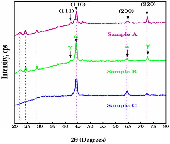 The X-ray diffractometry of the investigated specimens of Sample A, Sample B and Sample C after the complete heat treatment was presented in Figure 3. The Cukα radiation of wavelength 1.54 Å with a step size of 0.02 in the range of 10–80 of 2θ° Bragg’s angle were used for the structural study of the alloys. It was shown that peak broadening occurred at 21.9°, 24.09°, 28.7°, 42.08°, 44.4°, 47.1°, 64.7° and 72.4° in the Sample A alloy; at 22.1° 24.43°, 28.89°, 42.1°, 44.41°, 65.05° and 72.63° in the Sample B alloy and at 44.4°, 64.5° and 72.44° in the Sample C alloy. The accuracy of determining the Bragg’s angle was ±2°, while the peak broadening in the Sample C alloy corresponds to 31° with a crystal plane (100) and bcc structure related to the α-phase. Angle 2θ° at 22, 24.5, 29, 43 and 72.5 relates to the (111) and (220) crystal planes in Sample A alloy and Sample B alloy having an fcc crystal structure with γ- and δ- phases composition rich in Fe and Cr(M) where (M = Mo, Ti, etc.).