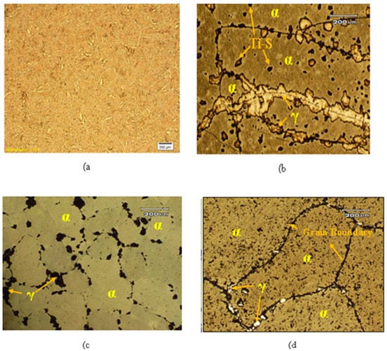 Optical micrograph consisting of single-phase alpha and gamma phases (a) the cast dendritic structure of (b) Sample A after complete heat treatment; (c) Sample B after complete heat treatment; and (d) Sample C after complete heat treatment.