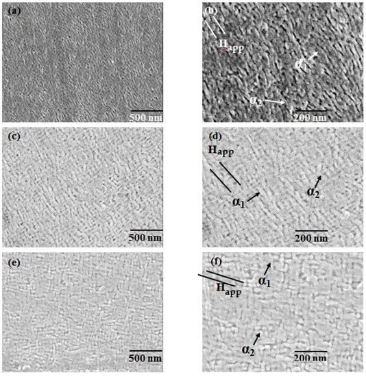 Field emission scanning electron microstructure showing spinodal phases with an α1-FM rod-like shape in the direction of the applied field embedded in the matrix of the α2-paramagnetic phase after complete heat treatment conditions: (a) Sample A; (b) amplified image of Sample A; (c) Sample B; (d) amplified image of Sample B; (e) Sample C; and (f) amplified image of Sample C.