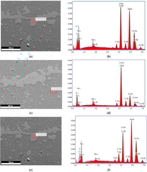 The crystal structure obtained after solution annealing was bcc at room temperature which is compared with the microstructures of the cast and compressed air quenched after the homogenization of Samples A, Sample B and Sample C in Figure 4. In Figure 4a, grains with dendrites originate from the grain boundaries and spread out towards the center of the grain. These dendrites are produced under isotropic conditions, i.e., in the cast structure of the grain which later affects the magnetic properties. Since our requirement is the coarse grain or single phase structure, we solutionized the alloy at 1250 °C for 5 h. The micrographs in Figure 4b–d indicate single-phase α with a bcc crystal structure which was well confirmed by XRD analysis. The normal (average) grain size determined by linear intercept method in (40 + x)Fe–28Cr–(26 − x)Co–3Mo–1Ti–2V alloy was 300 ± 5 μm. Brittleness and the unwanted γ-phase increase with the increase in Co concentration in the investigated alloy, as indicated in the micrograph of the 24 and 26 Co content (i.e., Figure 4b,c). These unwanted phases enriched in Fe, confirmed by EDX analysis, deteriorates the magnetic properties in the alloys. The grain size indicates that vanadium is responsible for extending the FM α-phase which refines and prolongs the annealed microstructure []. Grain formation began at high temperature solidification due to nucleation concentrated towards the center throughout the specimens. These grains were separated from each other by the grains boundary, as shown in Figure 4d. Reduction in the properties is enabled by the carbon and nitrogen content present in the atmosphere or raw material which are gamma phase-forming material: therefore, carbon or nitrogen contained in the studied alloy extends the γ-phase region. The vanadium content in the alloy also suppressed the Ti carbides and nitrides, resulting in the expansion of the α-phase structure, which remains the same after the final step aging state. The EDX analysis confirmed the black spot within the grain as a Ti–S inclusion, as shown in Figure 4.