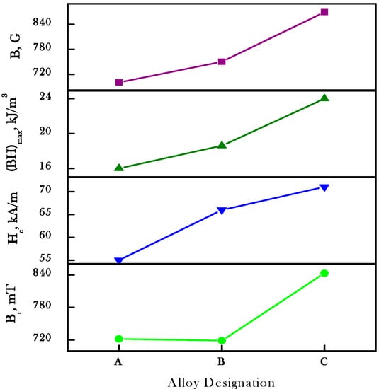 The best microstructure sample induced good magnetic properties in the alloys. The soaking time and magnetic field intensity were optimized for the isothermal field treatment (IFT) through experimentations which are 4.86 kOe and 30 min, respectively. The thermo-magnetic treatment are performed in the temperature range of 620–645 °C. The results revealed that magnetic properties strongly depend on the choice of TMT temperature. The difference in magnetic properties is related to the difference in elongation and volume fraction of spinodal phases produced during IFT and refined in aging treatments. Therefore, the optimum volume fraction of the spinodal phases was produced at 630 °C; thus, this was considered as the spinodal temperature for the studied alloys. The magnetic properties for Sample B alloy and Sample C alloy after complete treatment are presented in Figure 7, while their magnetic property parameters are depicted in Table 2. Figure 7 shows that the isothermal field treatment has a small effect on the 24Co (alloy B) than the 22Co (alloy C), meaning that the same elongation in the phases occurs at the optimized TMT temperature. The influence of the IFT temperature on alloy C due to the optimum level was achieved. The magnetic properties are increased with the increase in cobalt content, thus the optimum level are achieved for the ridge alloy 44Fe–28Cr–22Co–3Mo–1Ti–2V. The best magnetic properties of alloy C were Br = 843 mT, Hc = 71 kA/m and (BH)max = 24 kJ/m3. The addition of the cobalt content may contribute to the refining of the microstructure of the FM phase which enhances the magnetic properties. Magnetic properties versus the alloy designation after the complete heat treatment are shown in Figure 8, which contributed the better magnetic properties of the investigated alloy system.
