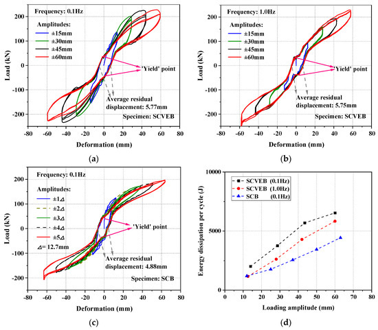 It can be seen that a non-linear hardening slope is followed after the elastic range. There is an obvious turning point (“yield” point) in the curve, as depicted in Figure 12a–c. The reason of this phenomenon is mainly attributed to the pre-tensioning status of the SMA cables before decompression. The “yield” loads for SCVEB and SCB are both around 30 kN, a value which is consistent with the amount of the pre-tensioned load. This indicates that the “yield” phenomenon is resulted from the decompression of the pre-tensioned SMA cables. Theoretically, the residual displacement of the SCB would be zero when the load is removed (see Figure 4). Viewing the result of 0.1 Hz series SCB test; however, the residual deformation did not return to zero as expected, but instead remained at a constant value during different loading cycles. This undesirable residual deformation may be due to defects in the brace itself (such as imperfect mechanical factors introduced during machining, manufacturing, and assembly), rather than the performance degradation of the materials (i.e., SMA cables), since SMA cables’ self-centering capability has been confirmed by the tests aforementioned in Section 3.1. In fact, the measured length of the outer tube is about 5 mm longer than that of the inner tube, which deviates from the original design that the lengths of the outer and inner tube should be the same. It should be noticed that the residual deformations of SCB and SCVEB were 4.88 mm and 5.77 mm (under 0.1 Hz), respectively; the results were very close to the aforementioned manufacturing error length between outer and inner tube (5 mm). Therefore, it can be concluded that the imperfect self-centering results were mainly resulted from the manufacturing errors. Although the manufacturing errors resulted in a maximum residual displacement of 4.88 mm in the specimen that only contains SMA cables (i.e., specimen SCB, as shown in Figure 12c), it did not much affect the completed brace specimen (i.e., SCVEB) to achieve the predicted hysteretic response, as shown in Figure 4. The “true” residual displacement of SCVEB was 5.77 − 4.88 = 0.89 mm, which was an accepted level.