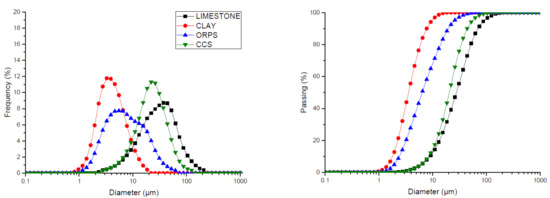 The chemical and physical compositions of the raw materials and wastes used in this study are shown in Table 3 with respect to the more stable oxides. The granulometric distribution of the raw materials used in this study are shown in Figure 2.