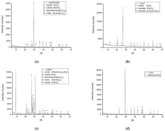 The limestone diffractogram in Figure 4a identified mainly crystalline peaks of quartz and calcite. According to Abrahão [36], silica in limestone was common and could be represented by microcrystalline quartz. The clay diffractogram in Figure 4b identified quartz, hematite, and kaolinite phases. The ORPS diffractogram in Figure 4c presented mainly peaks of quartz and calcite and minor peaks of annite and albite in agreement with Mesquita, Dall’Agnol, and Almeida [37] and Lima et al. [38]. Minor peaks of silicate minerals from the mica and feldspar groups were also found in ORPS. Lastly, the diffractogram of CCS in Figure 4d identified mostly calcite peaks.