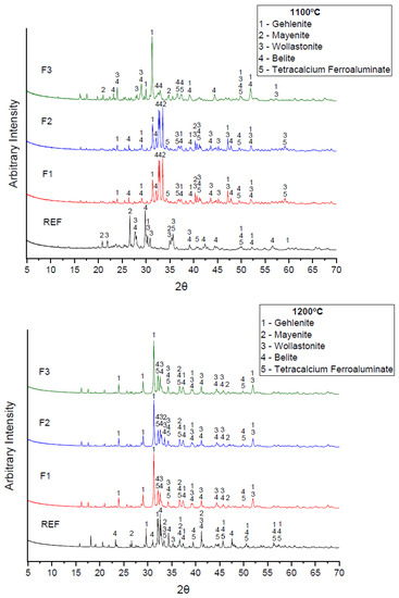 Formulations REF and F3 at 1100 °C and formulations F1, F2, and F3 at 1200 °C presented gehlenite as the majority phase. Gehlenite is a calcium aluminosilicate with low hydraulic properties. Its formation was related to elevated silica content [45] such as the case with ORPS or elevated alumina content as per Zhou et al. [46]. Limited quantities of gehlenite were considered tolerable [47], and its formation was noted both under laboratory and industrial clinker production [48]. However, such formulations should not be considered as having characteristics of belitic clinkers. Han et al. [49] noted that gehlenite could act as an inert material to increase the structural density of the clinker. However, Doval et al. [50] and Winnefeld et al. [51] cautioned that small particles of gehlenite were more reactive and could form strätlingite over long time periods, even more if impurities such as K+ or Na+ were present as they increased reactivity [52].