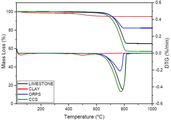 Thermogravimetric analyses of limestone, clay, ORPS, and CCS in natura are shown in Figure 6. The total mass losses of limestone and calcium carbonate sludge were 33.66% up to 787.85 °C and 41.72% up to 778.32 °C, respectively. These peaks were characteristic of calcium carbonate decomposition. The mass loss observed for ORPS was 16.67% up to 768.69 °C and was also related to the decarbonation of small amounts of calcite. The clay showed a mass loss of 3.74% up to 501.23 °C and was related to the dehydroxylation of kaolinite. The mass losses at the beginning of the heating process were related to water release and the burning of organic matter. The cited mass losses agreed with the chemical characterization results.