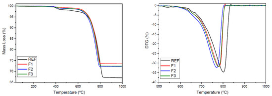 Thermal analyses were performed to confirm CO2 emission estimates per ton of each formulation from the sintering process. This was based on the method proposed by Costa and Ribeiro [32] and consisted of TG and DTG on the raw materials and formulations. The analysis temperature varied from 550 to 850 °C, which was the main interval of mass loss from decarbonation. Residual masses were taken at 1000 °C, and contributions from the expenditure of thermal and electrical energies were not considered.