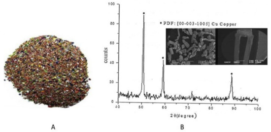 In Figure 1A, an image of the material is shown. This material was used in all the experiments, as well as the XRD spectrum (Figure 1B), from which it can be seen that the peaks correspond to the PDF file (00-003-1005) for copper. Figure 1B also shows the SEM (SE) images. The irregular morphology of the particles can be observed, and bright sections are also seen. These correspond to the typical non-metallic part of the PCBs. The particle sizes ranged from 0.5 mm to 1.2 mm, which could be beneficial for the metal extraction [18].
