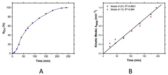 (A) Type S curve for the Cu leaching and (B) treatment of leaching data with the kinetics models of 1/3 [1 − (1 − XCu)1/3], and 2/3 [1 − 3(1 − XCu)2/3 + 2 (1 − XCu)].