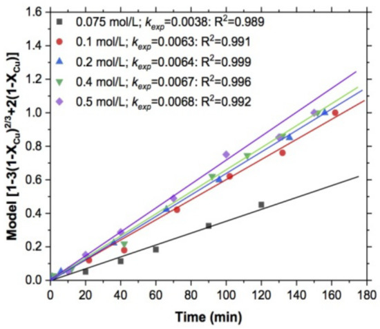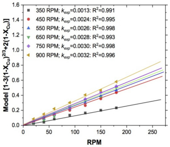 This effect was studied in the range of 350 to 900 RPM, keeping constant T = 318 K, pH = 10, = 0.5 mol/L, 1 atm O2 and 5 g of sample; the representation of the fraction of leached copper was evaluated using the kinetic model described in Equation (2) [29,30] for all experiments carried out.