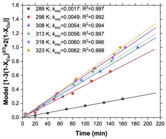 where XCu is the reacted fraction of Cu (from 0 to 1), VM is the molar volume of material (Cu = 8.09 cm3/mol), cA is the concentration of leaching reactant (in this case the thiosulfate in mol·L−1), kq is the kinetic coefficient (in min−1), Dc is the diffusion coefficient through the product layer, r0 is the initial radius of particle (average, in m), kexp is the experimental constant (in min−1), t is the time (in minutes), and n is the order of the reaction.