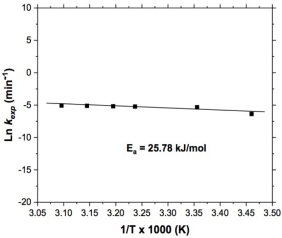In order to determine whether our system was controlled by hydrodynamic or non-chemical variables, it was necessary to determine the activation energy, which was obtained from the treatment of kexp data according to the Arrhenius equation [52,53] where the slope obtained (m = −(Ea/R) of the linear curve represented the activation energy (Ea) divided by the negative value of the universal gas constant.
