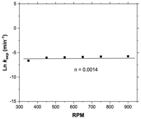 To confirm the above, it was essential to determine the reaction order of this variable, so in Figure 5, a straight line representing the kexp of the effect studied was obtained. This resulted from plotting the logarithm of kexp vs. the logarithm of the reagent concentration tested (i.e., the slope m, obtained from this plot [52,53]), the value of the reaction order calculated from the straight line showed a reaction order of the system of n = 0.22. This value indicated that the kexp was determined by a factor different from the reagent concentration, which confirmed that effectively our system was governed by the control of mass transport to the solid–liquid interface.
