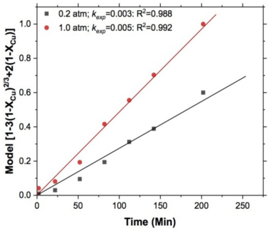 The effect of oxygen partial pressure was evaluated keeping the following parameters constant: T = 318 K, pH = 10, = 0.5 mol/L, 750 RPM, and 5 g of sample. The effect of this variable on the leaching of copper in the system is shown in Figure 10, where the values of the experimental constants resulting from these experiments had low values; however, it can be seen that the value of kexp at 1 atm was almost double that obtained for 0.2 atm. This result indicates that there is a strong dependence between the reaction rates and the amount of oxygen dissolved in the system.