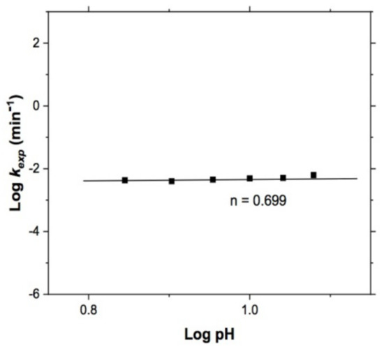 Figure 11 shows the dependence of kexp on the pH value, and Figure 12, the effect that this variable had on copper leaching, showing a reaction order of n = 0.699. This value indicates some dependence of copper leaching on pH and that this reagent works better at high pH values, since when working at pH levels above 7 [51], the dependence of the thiosulfate on the pH is evident.