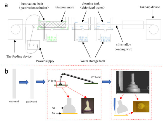 Figure 1a provides an illustration of the cathodic passivation device. The silver alloy bonding wire was sequentially immersed into the passivation solution and deionized water. A current of 500 A/m2 was applied to the wires and the passivation solution. The wire is the cathode. The wire was processed in the passivation solution for 5 s at 25 °C.