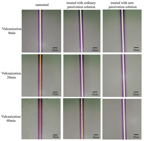 Comparison of the surface of the passivated silver alloy bonding wires in different solutions, before and after vulcanization for 20 and 60 min.