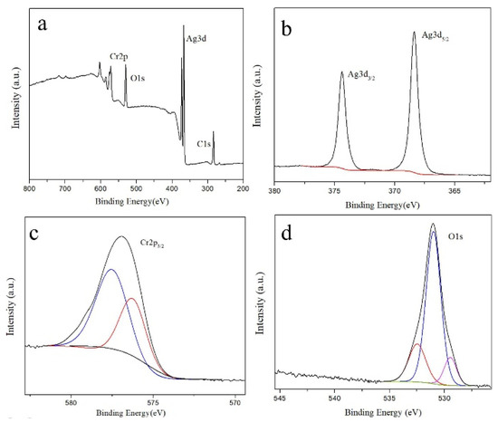 XPS spectra of the passivated silver plates in the Pd-free solution after storage for 5 days. (a) Survey spectra; (b) Ag3d spectra; (c) Cr2p spectra; (d) O1s spectra.