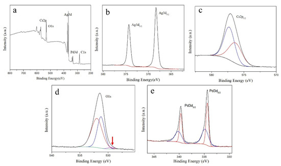 XPS spectra of the passivated silver plates in the Pd-containing solution after storage for 5 days. (a) Survey spectra; (b) Ag3d spectra; (c) Cr2p spectra; (d) O1s spectra; (e) Pd3d spectra.