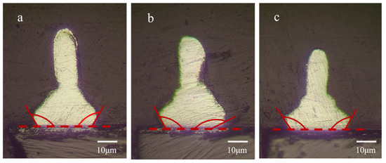 Cross-section images of the bonded wires on the pads before the shear force tests. (a) Untreated wire. (b) Wire passivated in the Pd-free solution. (c) Wire passivated in the Pd-containing solution.