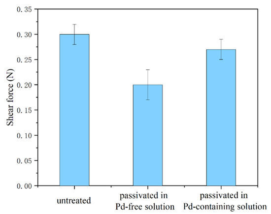 Figure 6 shows the measured bonding strength of the wires. The untreated wires, the wires passivated in the Pd-free solution, and the wires passivated in the Pd-containing solution. fractured at mean shear forces of 0.30, 0.20, and 0.27 N, respectively. Through the use of the Pd-containing solution for passivation, the strength of the treated bonding wire increased by 35%, compared to the wire treated in the standard Pd-free solution.