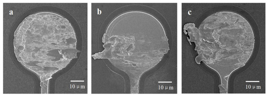 Bonding reliability is another important property of bonding wires. The device will fail, as long as one of the bonding points is damaged. Generally, the failure modes of the solder ball of wire bonding can be divided into intra-ball failure and interfacial failure, which usually start from the intermetallic compounds, interfacial voids and interfacial corrosion points [8,9]. Zhang et al. [10] studied the failure of LED packages and pointed out that the stress concentration generated in the thermal shock test can lead to the neck fracture of the solder balls. On the other hand, interfacial failures are also widely observed. Wu et al. [11] conducted power cycle life tests on different types of insulated gate bipolar translator (IGBT) modules, and found that the recrystallization and electrothermal migration could lead to the fracture of the bonding interface. Zheng et al. [12] found that the separation of the bonding wire and the pad is the main failure mode of IGBT modules. The mismatch of thermal expansion coefficients between the bonding wire and the chip causes stress concentration and leads to cracks at the bonding interface to form an open circuit.