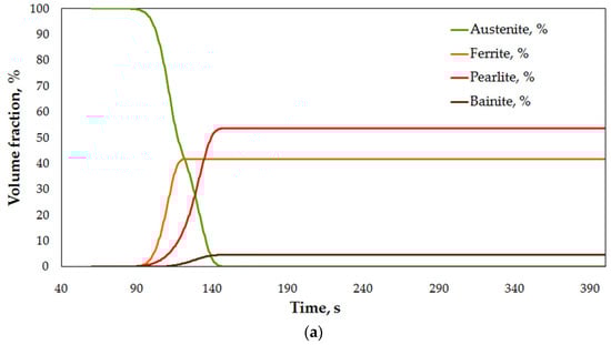 The obtained cooling plots are shown in Figure 15. One can notice that spray cooling produces larger differences of temperature, which tends to equalize right after spray passes over. A bigger gradient of temperature from the center of the ears towards the surface results in reversed heat flux, causing the temperature increase, reaching 100 °C (decreasing towards the center of the cross-section). Its presence on the numerically estimated curves and its correct location on CCT diagram indicates reliability of the transformation model.