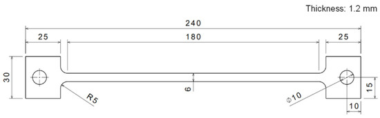 In order to confirm the amount of springback, test specimens were prepared from the sheet with a large-scaled dog-bone shape, as shown in Figure 1. Each specimen has a rectangular test section with 180 mm length and 6 mm width. The length of specimen was aligned with the rolling direction (RD) of the sheet. Two grip sections of each specimen exist to connect electrodes of a power supply for imposing the electric current. All specimens were blotted and polished by using the oil paper and a 2000 grit abrasive paper to remove oil-layer and contamination on the surface because those would lead to being locally burnt with sparks while the electric current is applying.