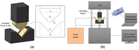 V-bending testing was designed to perform lab-scaled springback tests, as shown in Figure 2. In Figure 2a, the punch and the die were developed to be assembled into a universal testing machine (UTM). With consideration of applying the electric current, the fixtures were fabricated with a machinable glass-ceramic MACOR® (CORNING Inc., Corning, NY, USA) to insulate themselves from the current. The V-shaped punch and die adopted a bent-angle of 90°, a punch radius of 20 mm, and a die width of 100 mm. Figure 2b illustrates a schematic diagram of overall V-bending tests with the electric current and measurement systems. The bending tests were carried out by using the MTS810 (MTS Systems Corporation, Eden Prairie, MN, USA), which is a conventional UTM. For generating the electric current, a power supply SPU-1000 (Hyundai Welding, Seoul, South Korea) was utilized. The anode and cathode electrodes were installed to each grip section of a specimen, respectively. Force and displacement data were obtained from the UTM while temperature of specimen was measured from an infra-red (IR) camera system, FLIR T620 (Teledyne FLIR, Wilsonville, OR, USA), to observe temperature changes of a specimen due to the Joule heating.