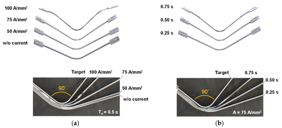 Equation (3) contains the initial volume ( (V)), current ( (A)), electrical resistance ( (Ω)), pulse duration ( (s)), electrical resistivity ( (Ωmm)), initial cross-sectional area ( (mm2)), and initial length ( (mm)). The electric energy density can be calculated with the nominal current density ( (A/mm2)), electrical resistivity and pulse duration. In this paper, the electrical resistivity of 10−4 Ωmm is utilized for a general steel sheet. The calculated energy densities are listed in Table 4 to be corresponding to each electric current condition. Figure 5c shows the springback reduction regarding the electric energy density. The expression of (100 A 0.50 s) means the nominal current density of 100 A/mm2 with the pulse duration of 0.50 s. Since the electric energy densities of (50 A 0.50 s) and (75 A 0.25 s) are similar to each other, the springback angles are almost the same with the amount of about 31°. In the case of (100 A 0.50 s), the corresponding energy density is the maximum, so the springback reduction is the largest with the amount of 85.4%.