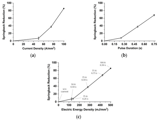 Springback reduction regarding: (a) Current density; (b) Pulse duration; (c) Electric energy density.