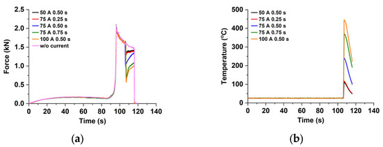 In order to identify the effect of the electric current in detail, various conditions of the single-pulsed current were applied to specimens with different current densities and pulse durations, as listed in Table 3. For the effect of the current density, the pulse duration was fixed with 0.50 s while the nominal current densities were 50, 75, and 100 A/mm2. On the other hand, related to the effect of the pulse duration, the current density was fixed with 75 A/mm2 while the pulse durations were 0.25, 0.50, and 0.75 s. The single-pulsed current was generated from the power supply with a square shape, so the electric current consistently applied to the specimen for the pulse duration. All tests were performed three times to acquire repeatability.