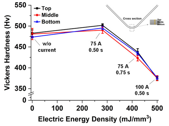 To identify changes in the strength after imposing the electric current, micro-Vickers hardness tests were performed by utilizing a micro-hardness testing machine of the Mitutoyo 810–127 K. Likewise, the hardness measurement was conducted from the three points of the top, middle, and bottom, meaning the inner, near the neutral and the outer layers respectively. Figure 10 shows the measured hardness with standard deviations (error bar) regarding the electric energy density. The hardness in the case of w/o current is comparable to that in the case of (75 A 0.50 s). In the cases of (75 A 0.75 s) and (100 A 0.50 s), however, the hardness differs from the w/o current case and decreases as the electric energy density increases. It reveals that flow stress would decrease due to high electric energy, which might be an undesired situation for manufacturing structural components. The observations that the hardness remarkably drops at high electric energy while the springback is reduced even at lower electric energy are in agreement with the previous work [24] on the springback and the Vickers hardness changes of ultra-high-strength steels by the Joule heating. The tendency of the hardness corresponds to the microstructural observations. Because the microstructural does not change remarkably, the hardness values are comparable for the cases of w/o current and (75 A 0.50 s). On the other hand, the hardness values for both cases of (75 A 0.75 s) and (100 A 0.50 s) are decreased as well as far from the reference value of w/o current case since the microstructural evolution is observed. Therefore, it is noted that the single-pulsed current with a proper parameter set is very effective and useful to reduce the amount of the springback without changes in material properties. When the main purpose is the springback reduction regardless of the property changes, higher electric energy would be a good solution to attain a huge amount of the springback reduction.