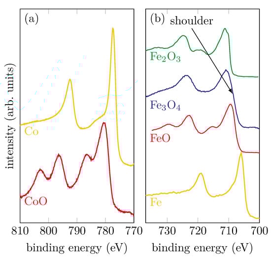 For metallic Co and Fe, it can be seen that there are no satellites and the peak shape is asymmetric. CoO, which consists only of Co2+ ions, has two shake-up satellites that are shifted to higher binding energies by compared to the main peaks. For the iron oxides, the observation of the satellites, in addition to the different positions of the main peaks, provides information about the oxidation state. Considering FeO, which contains exclusively Fe2+ ions, a charge-transfer satellite can clearly be seen at still higher binding energies for both Fe 2p photoelectron peaks. If one compares this with Fe2O3, whose iron cations are exclusively trivalent, it can be seen that, in addition to different binding energies for the main peaks, the charge-transfer satellites are also shifted towards higher binding energies. For magnetite (Fe3O4), iron is present in both the Fe3+ and Fe2+ states. For this reason, the two satellites observed in the Fe2O3 and FeO spectra overlap and form a flat plateau between the main peaks of the Fe3O4 spectrum without any apparent satellite.