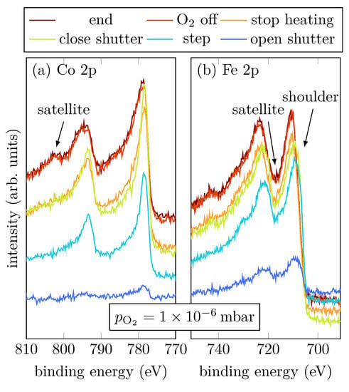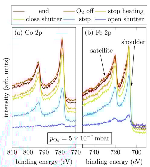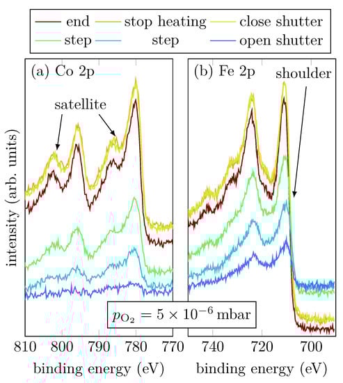 Sample A was grown with a low oxygen partial pressure of . Figure 2a,b show the Co 2p and Fe 2p peaks, respectively, at selected steps during the RMBE process.